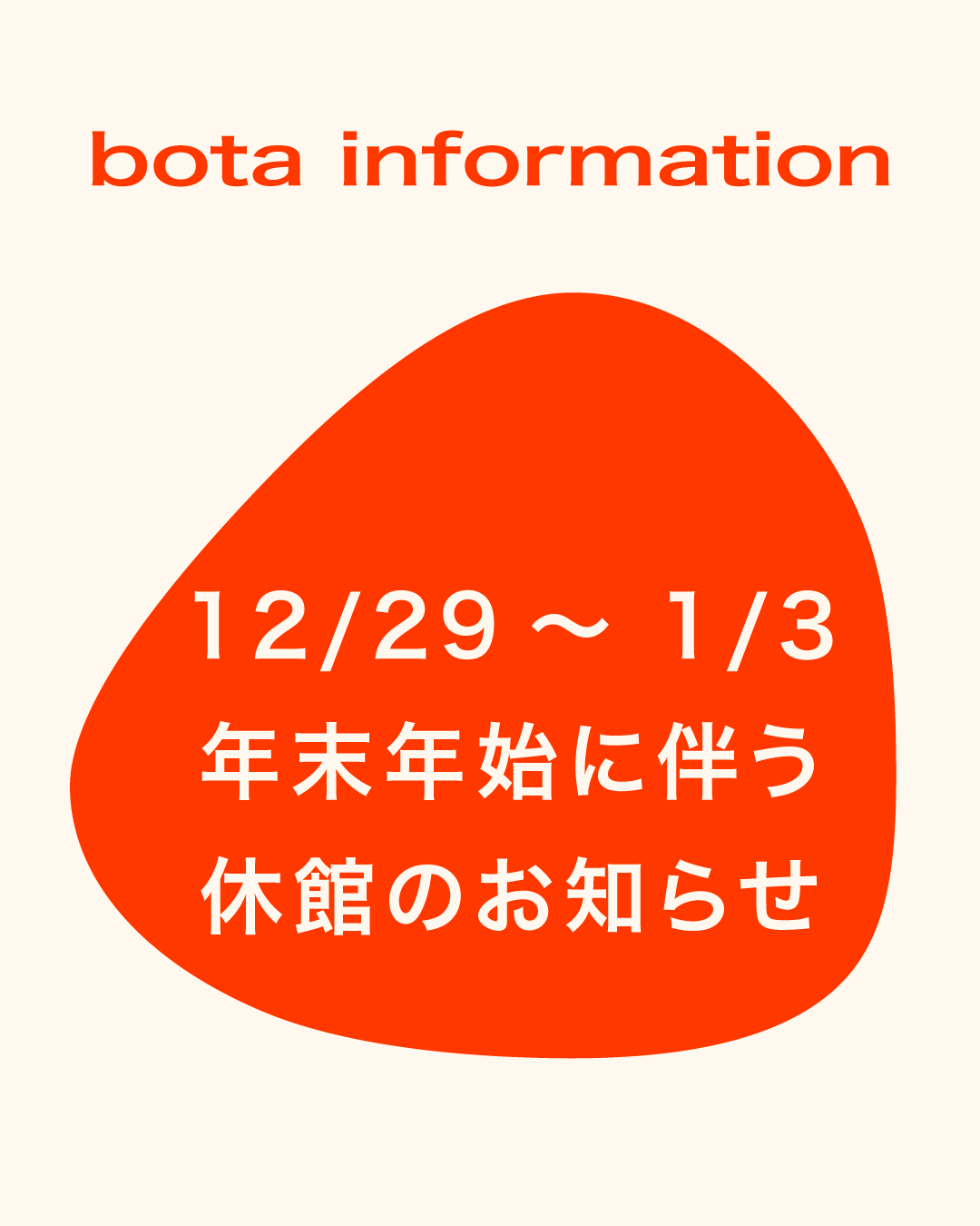 いつもbotaをご利用いただきありがとうございます。 年末年始に伴い、 2025年12月29日(月)~2026年1月3日(土)は全館休館となります。 ご利用のお客様にはご不便をおかけいたしますが、 何卒ご理解賜りますようよろしくお願い申し上げます。